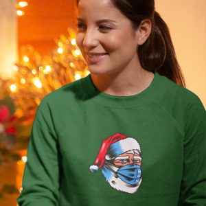 De corona kerstman met een mondkapje maakt deze groene kersttrui helemaal af! Geef deze grappige sweater cadeau of draag hem zelf naar de kerstborrel of op een van de kerstdagen! Door deze unieke opdruk ga je sowieso de blits maken bij je vrienden, collega's en familie. Door de uniseks pasvorm is de kersttrui geschikt voor dames en heren. Verkrijgbaar in de maten XS t/m 4XL.