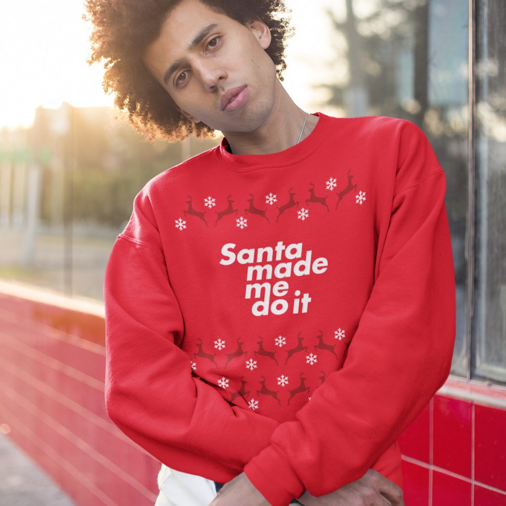 Deze rode kersttrui met de tekst "Santa Made Me Do It" en rendieren patroon is alleen verkrijgbaar bij 1001Caps! Het is de ideale sweater om op foute kersttruiendag te dragen op het werk, of tijdens een familiebezoekje. De sweater heeft een mooie kleurencombinatie van wit, rood en donkerrood. De uniseks pasvorm is geschikt voor dames en heren. Verkrijgbaar in maat XS t/m 4XL.