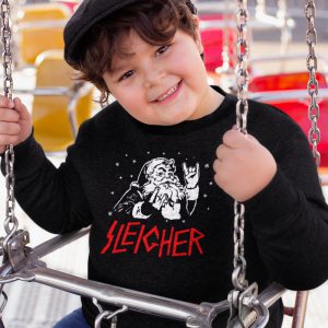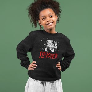 De grappigste kerstkleding voor stoere kids vindt je bij foutekerstsweater.nl. Neem nu deze stoere zwarte sweater met grappige print Sleigher Santa, jouw zoon of dochter steelt de show tijdens de kerstviering op school en bij opa en oma tijdens het kerstdiner! Deze mooie sweater is verkrijgbaar voor jongens en meiden in de maten 3 t/m 14 jaar Bekijk de maattabel onderaan de pagina voor de juiste pasvorm: