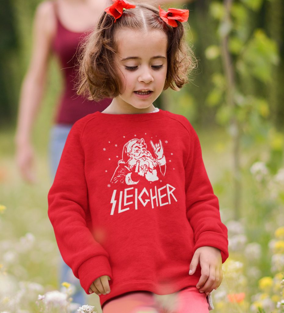 Voor de grootste kleine fans van metal en rock muziek, deze stoere rode sweater met print Sleigher Santa. Houdt jouw dochter of zoon ook wel van stoere rock muziek? Dan hoef je niet verder te zoeken voor de juiste foute kerstsweater. Op foutekerstsweater.nl vindt je de grootste unieke collectie kerstsweaters van dit moment. Bekijk de maattabel onderaan de pagina voor de juiste maat.
