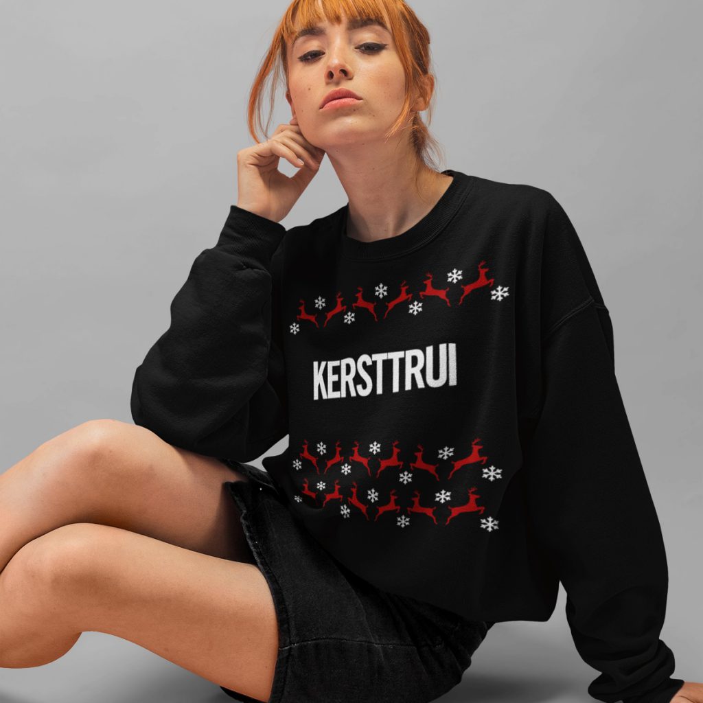 Dit is de ultieme zwarte, foute kersttrui met de tekst "Kersttrui" en een mooi rendieren patroon! Draag deze foute kersttrui op het werk, bij het kerstdiner of op een kerstborrel en maak helemaal de blits. De sweater heeft een uniseks pasvorm en is daarom geschikt voor dames en heren. Verkrijgbaar in de maten XS t/m 5XL.