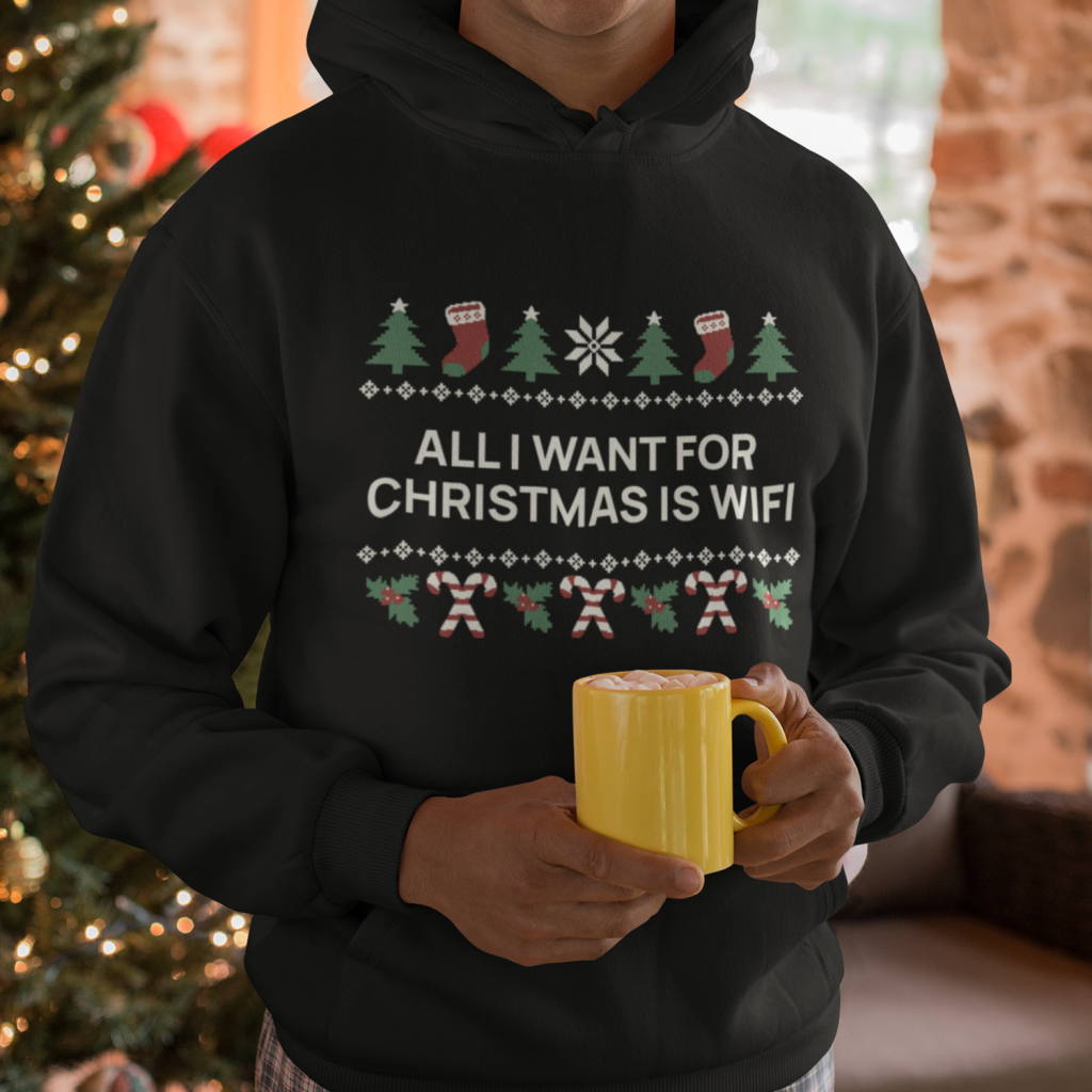 Gen Z Kerst Hoodie Zwart All I Want For Christmas Is WiFi