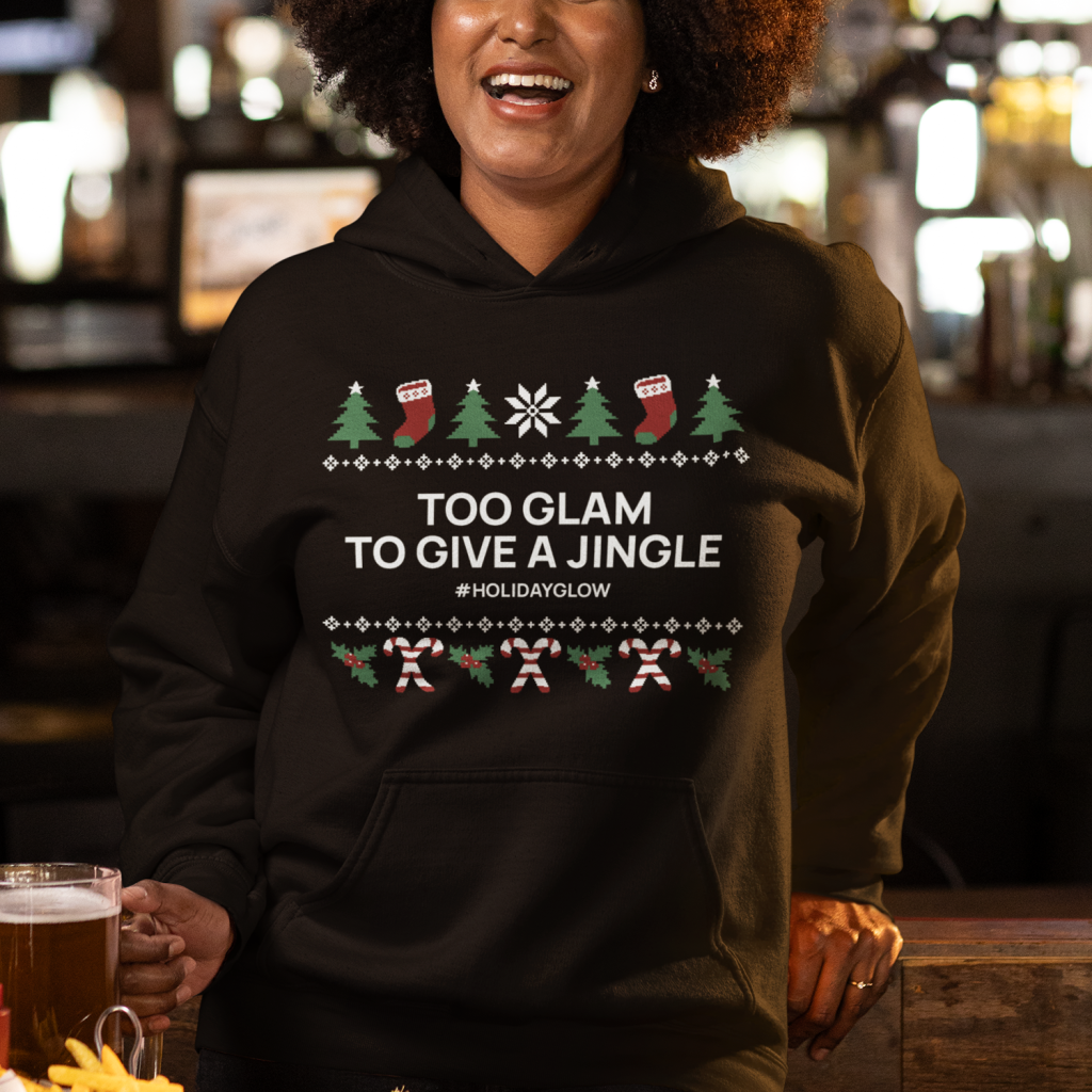 Gen Z Kerst Hoodie Zwart Too Glam Too Give A Jingle #Holidayglow
