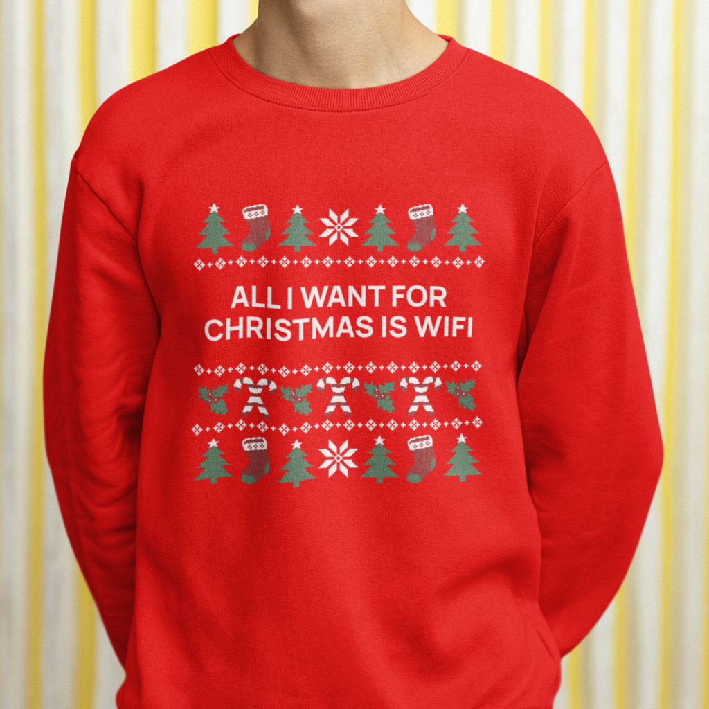 Deze kersttrui is voor iedereen die weet: de enige echte kerstwens is WiFi, no questions asked. 📶🎄 Perfect voor als je niet zonder internet kunt overleven tijdens de feestdagen. Verkrijgbaar in maat XS t/m 4XL met een uniseks fit die je helemaal chill maakt. Haal ‘m nu en zorg ervoor dat je dit kerstseizoen altijd connected bent. ✨