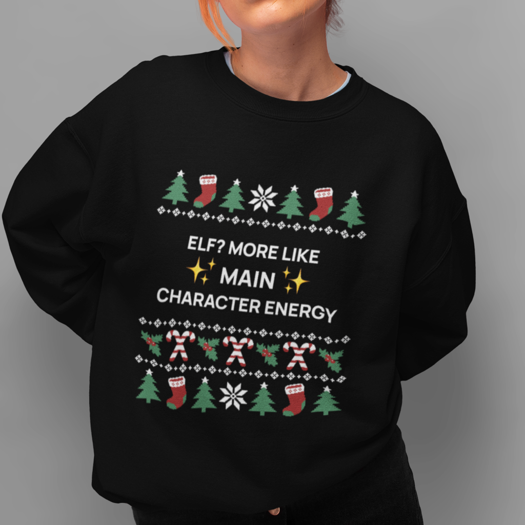 Gen Z Kerst Sweater Zwart Elf? More Like Main Character Energy