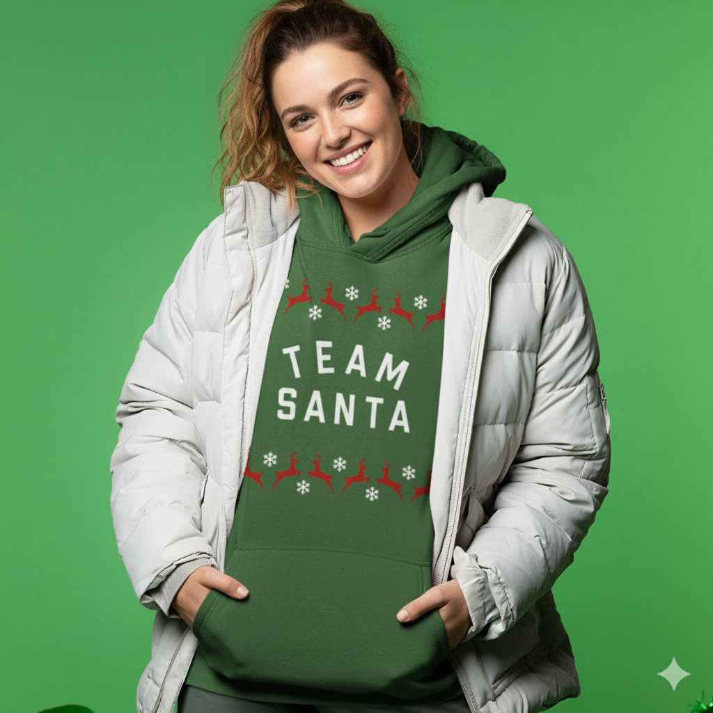 Groene kerst hoodie met rendieren design en de tekst Team Santa. Speciaal voor de grootste fans van de kerstman! Leverbaar in XS t/m 4XL.