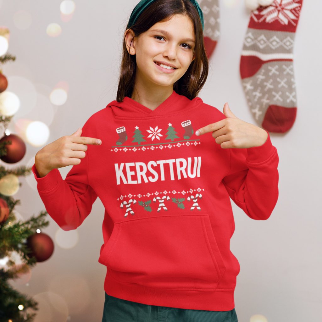 Deze unieke kerst hoodie voor kinderen heeft het Candy Cane design en de tekst Kersttrui op de borst. De rode sweater met capuchon is leverbaar voor kinderen van 3 t/m 14 jaar. Dit prachtige model is uitsluitend te bestellen bij 1001Caps!