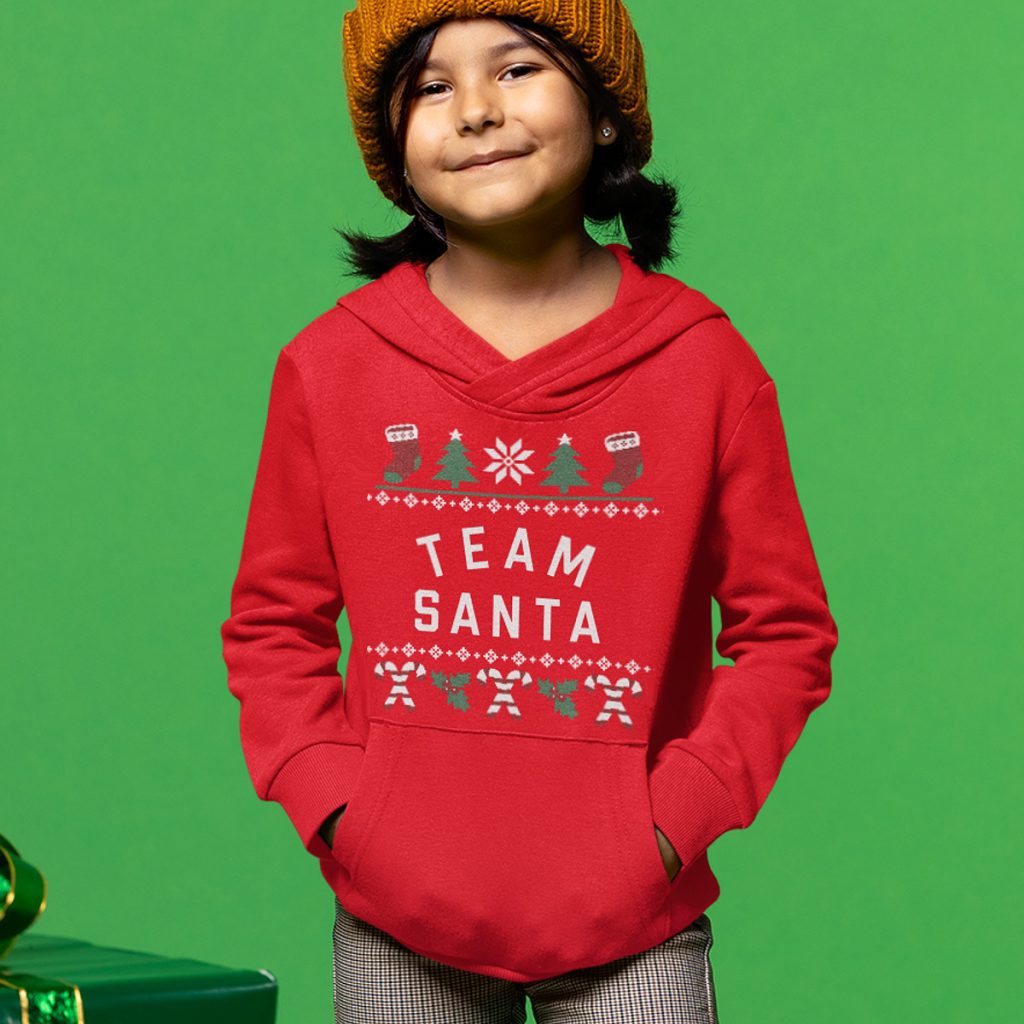 Als je aan de kant van de kerstman staat, dan is deze rode kerst hoodie met Team Santa echt voor jou! Door het kleurrijke Candy Cane design is het een opvallende sweater, welke exclusief te verkrijgen is bij 1001Caps. Leverbaar voor kinderen van 3 t/m 14 jaar.