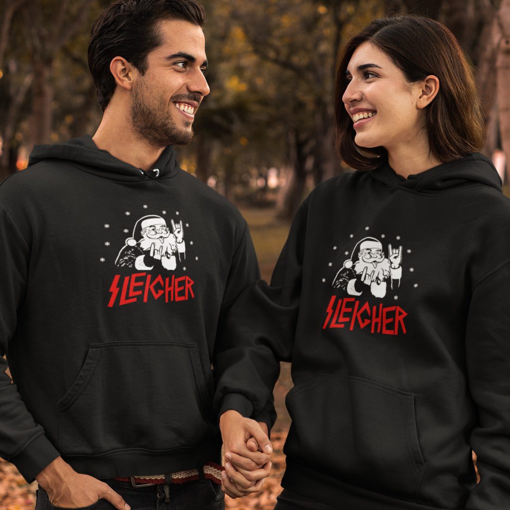 Deze exclusieve set kerst hoodies met de kerstman en de tekst Sleigher is een must have als je van een goed feestje houdt! De zwarte hoodie sweaters hebben een uniseks fit en zijn daarom geschikt voor dames en heren. De unieke kleurencombinatie maakt dat de foute kerstkleding meteen in het oog springt. Leverbaar in de maten XS t/m 4XL.