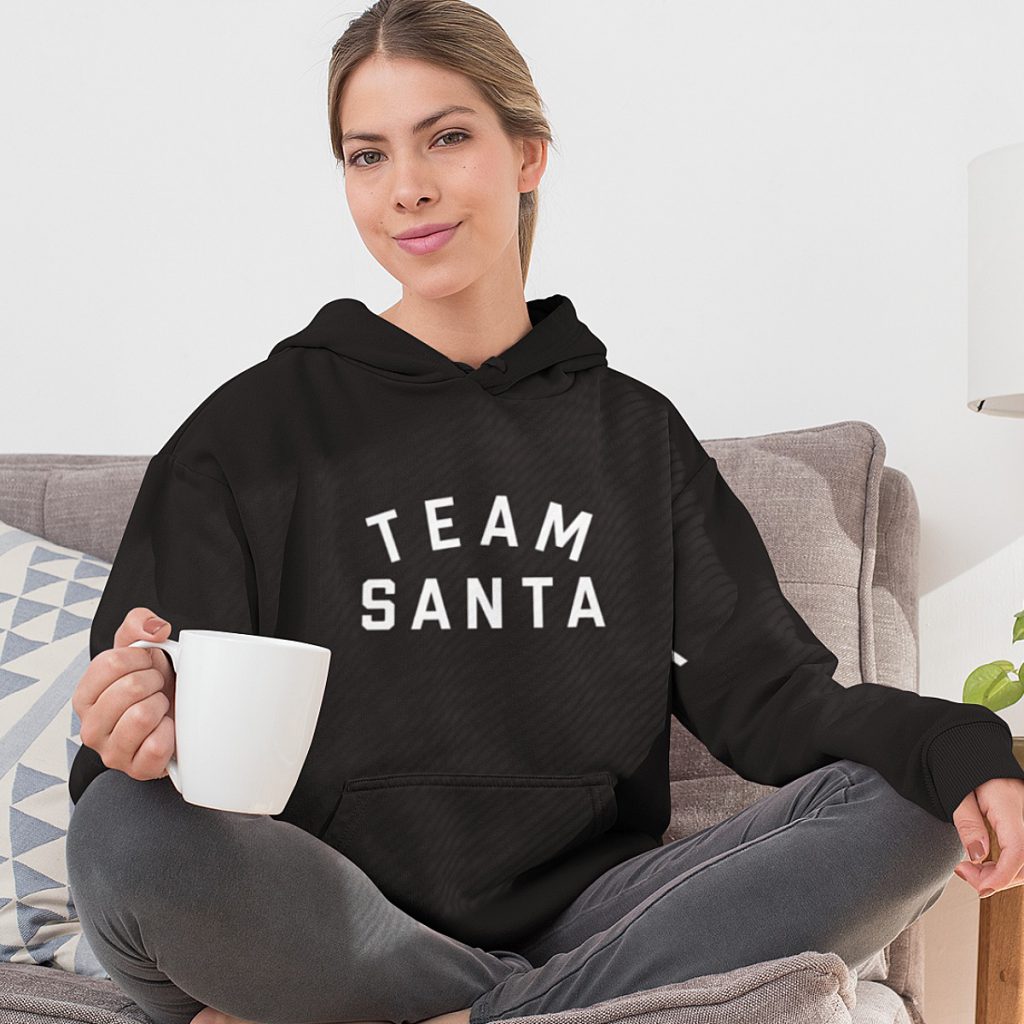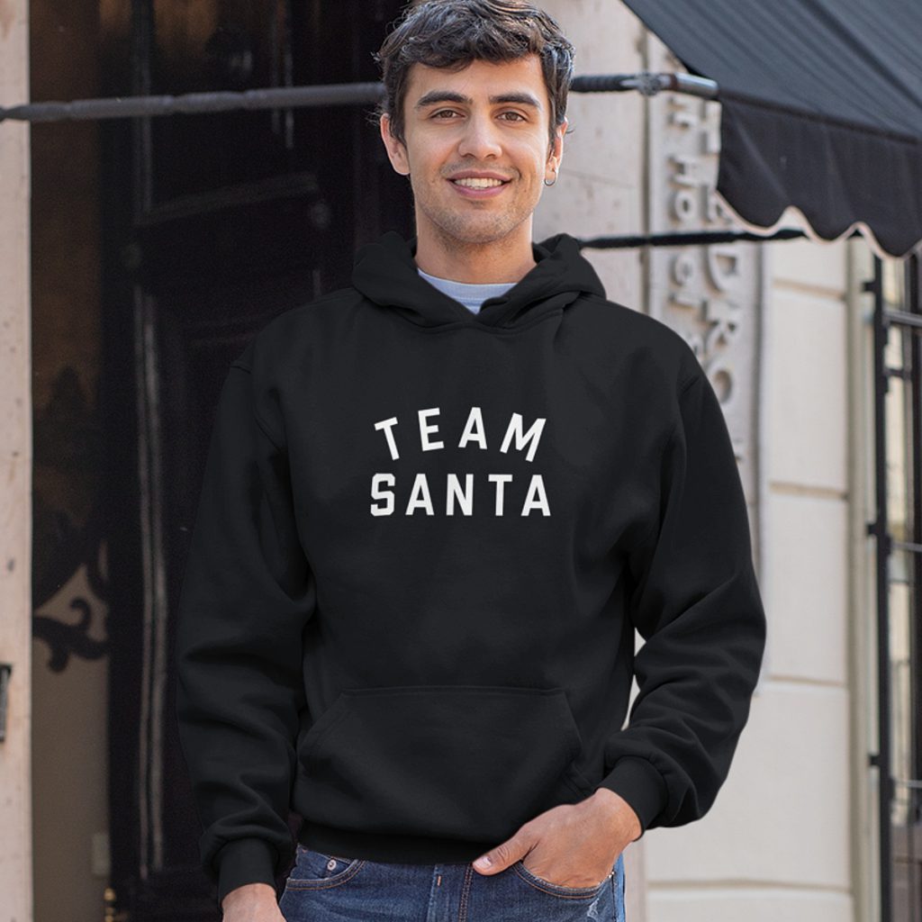 Met de zwarte Team Santa kerst hoodie kom je modieus voor de dag tijdens Kerstmis. Het is een stoere kersttrui omdat de sweater zwart gekleurd is en het lettertype sportief aandoet. Dat is nog eens iets anders dan al die felgekleurde kleding die men met de feestdagen draagt! De uniseks fit van de kerst hoodie is geschikt voor dames en heren. Verkrijgbaar in de maten XS t/m 5XL.