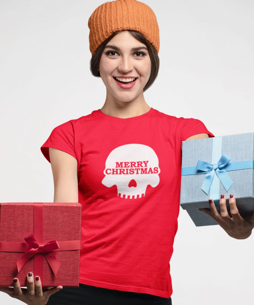 Het Foute Kerst T shirt Merry Skull is het T shirt voor dames en heren die over een dosis zwarte humor beschikken. Een rood T shirt met opvallende print dat één ieder een Merry Christmas wenst! Voor de perfecte pasvorm leverbaar in een dames- en herenfit in een ruime maatkeuze. Check de maattabellen onderaan de pagina voor de juiste pasvorm.