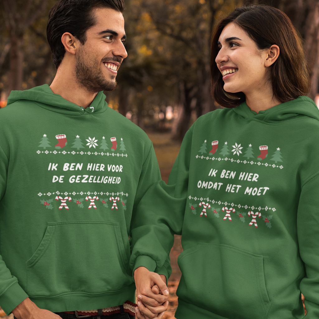 Koppel Kerst Hoodies Groen Ik Ben Hier Voor De Gezelligheid | Ik Ben Hier Omdat Het Moet - Candy Cane