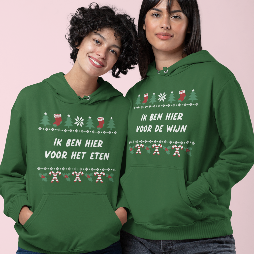 Koppel Kerst Hoodies Groen Ik Ben Hier Voor Het Eten | Ik Ben Hier Voor De Wijn - Candy Cane