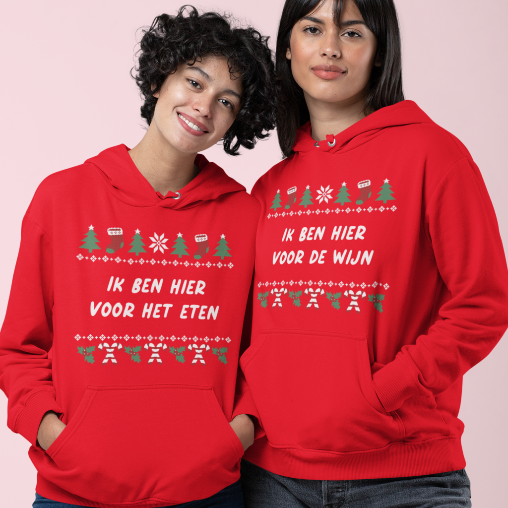 Vier kerst in stijl met onze stelletjes kersttruien! 🎄 Trui 1: "Ik ben hier voor het eten" – Voor de snackkoning of -koningin. Trui 2: "Ik ben hier voor de wijn" – Voor de liefhebber van een goed glas. Waarom kiezen als je beide kunt hebben? Bestel snel en maak dit seizoen extra feestelijk! 🎅 Ook verkrijgbaar zonder capuchon!