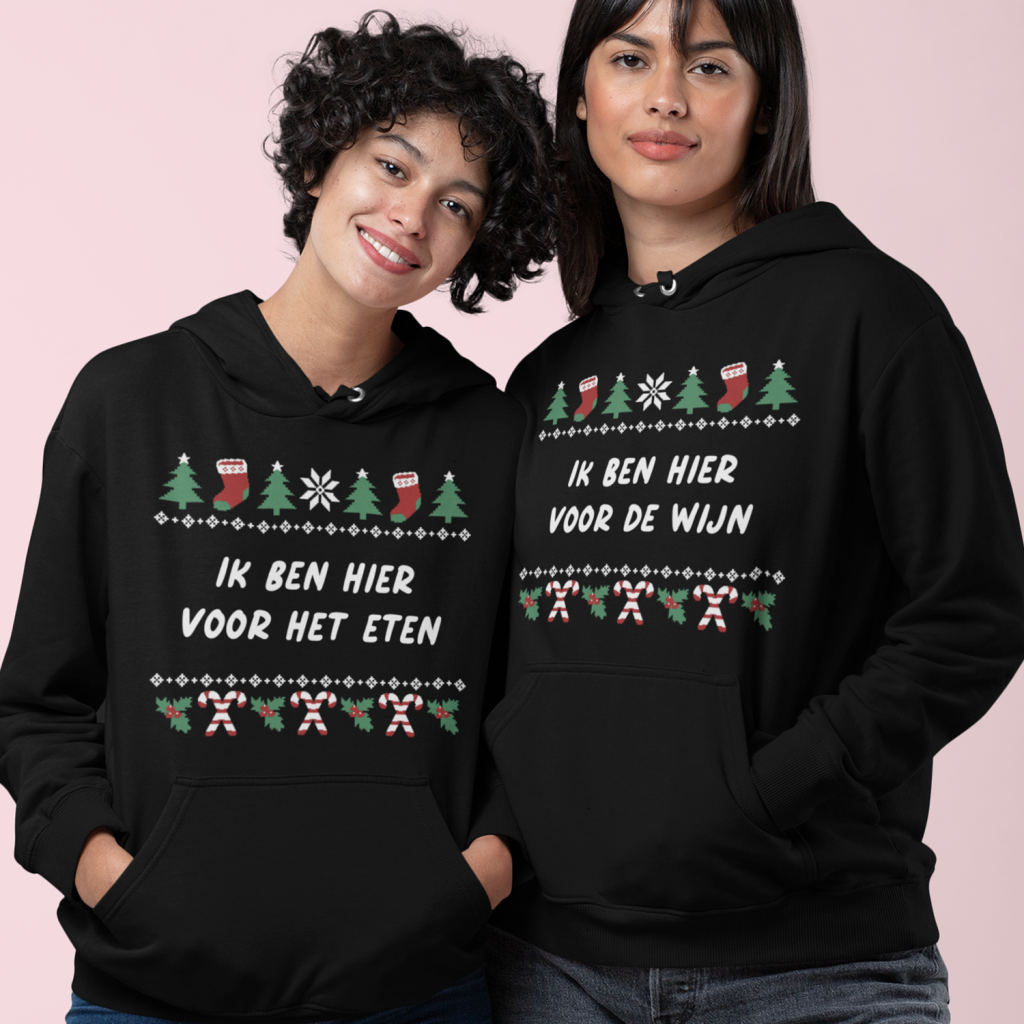 Vier kerst in stijl met onze stelletjes kersttruien! 🎄 Trui 1: "Ik ben hier voor het eten" – Voor de snackkoning of -koningin. Trui 2: "Ik ben hier voor de wijn" – Voor de liefhebber van een goed glas. Waarom kiezen als je beide kunt hebben? Bestel snel en maak dit seizoen extra feestelijk! 🎅 Ook verkrijgbaar zonder capuchon!