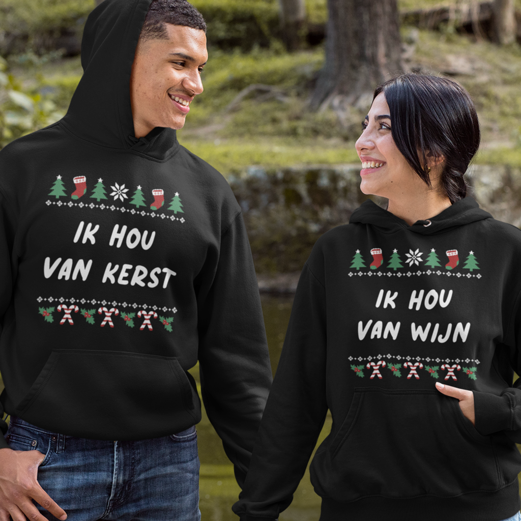 Vier kerst in stijl met onze stelletjes kersttruien! 🎄🍷 Trui 1: "Ik hou van kerst" – voor de ultieme kerstfan. Trui 2: "Ik hou van wijn" – voor de wijnliefhebber. Waarom kiezen als je beide kunt hebben? Bestel snel en maak dit seizoen extra feestelijk! 🎅 Ook verkrijgbaar zonder capuchon!