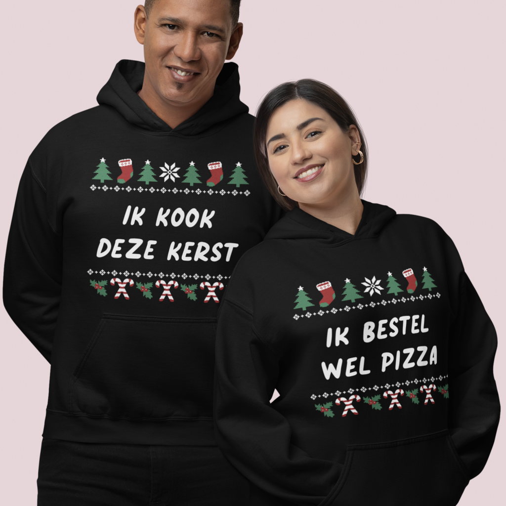 Vier kerst in stijl met onze stelletjes kersttruien! 🎄 Trui 1: "Ik kook met kerst" – Voor de keukenheld van het gezin. Trui 2: "Ik bestel wel pizza" – Voor de echte feestdagenrebel. Waarom kiezen als je beide kunt hebben? Bestel snel en maak dit seizoen extra feestelijk! 🎅 Ook verkrijgbaar zonder capuchon!