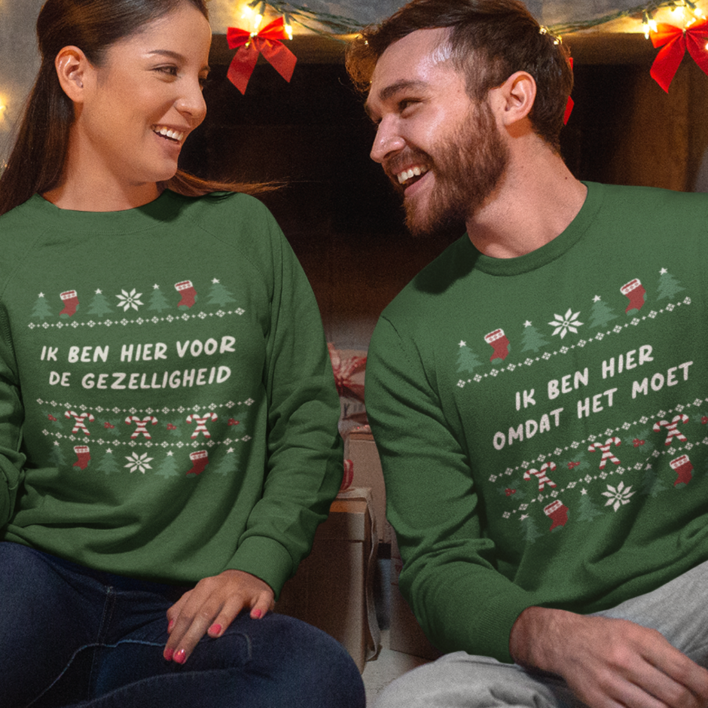 Vier kerst in stijl met onze stelletjes kersttruien! 🎄 Trui 1: “Ik ben hier voor de gezelligheid” – Voor de sfeermaker van de avond. Trui 2: “Ik ben hier omdat het moet” – Voor degene die liever thuis was gebleven. Waarom kiezen als je beide kunt hebben? Bestel snel en maak dit seizoen extra feestelijk! 🎅 Ook verkrijgbaar met capuchon!