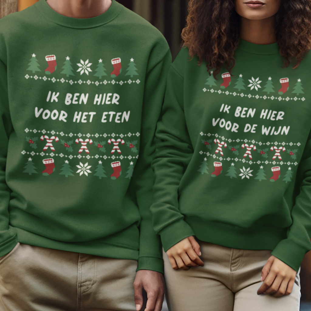 Koppel Kerst Sweaters Groen Ik Ben Hier Voor Het Eten | Ik Ben Hier Voor De Wijn - Candy Cane