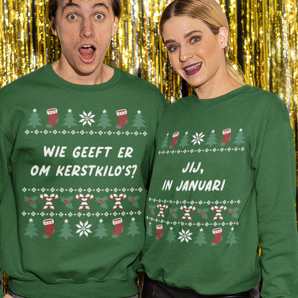 Vier kerst in stijl met onze stelletjes kersttruien! 🎄 Trui 1: “Wie geeft er om kerstkilo’s?” – Geniet zorgeloos van al het lekkers. Trui 2: “Jij, in januari” – De perfecte comeback voor je partner. Waarom kiezen als je beide kunt hebben? Bestel snel en maak dit seizoen extra feestelijk! 🎅 Ook verkrijgbaar met capuchon!