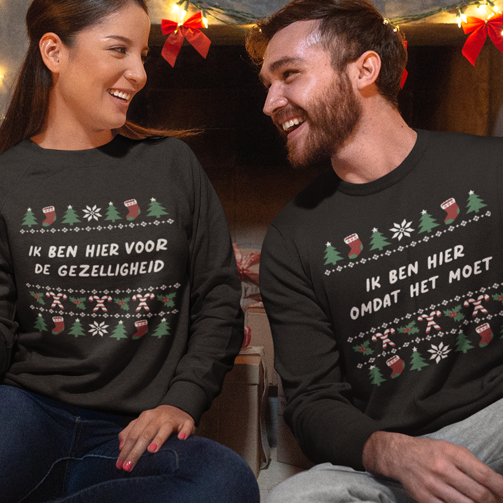 Vier kerst in stijl met onze stelletjes kersttruien! 🎄 Trui 1: “Ik ben hier voor de gezelligheid” – Voor de sfeermaker van de avond. Trui 2: “Ik ben hier omdat het moet” – Voor degene die liever thuis was gebleven. Waarom kiezen als je beide kunt hebben? Bestel snel en maak dit seizoen extra feestelijk! 🎅 Ook verkrijgbaar met capuchon!