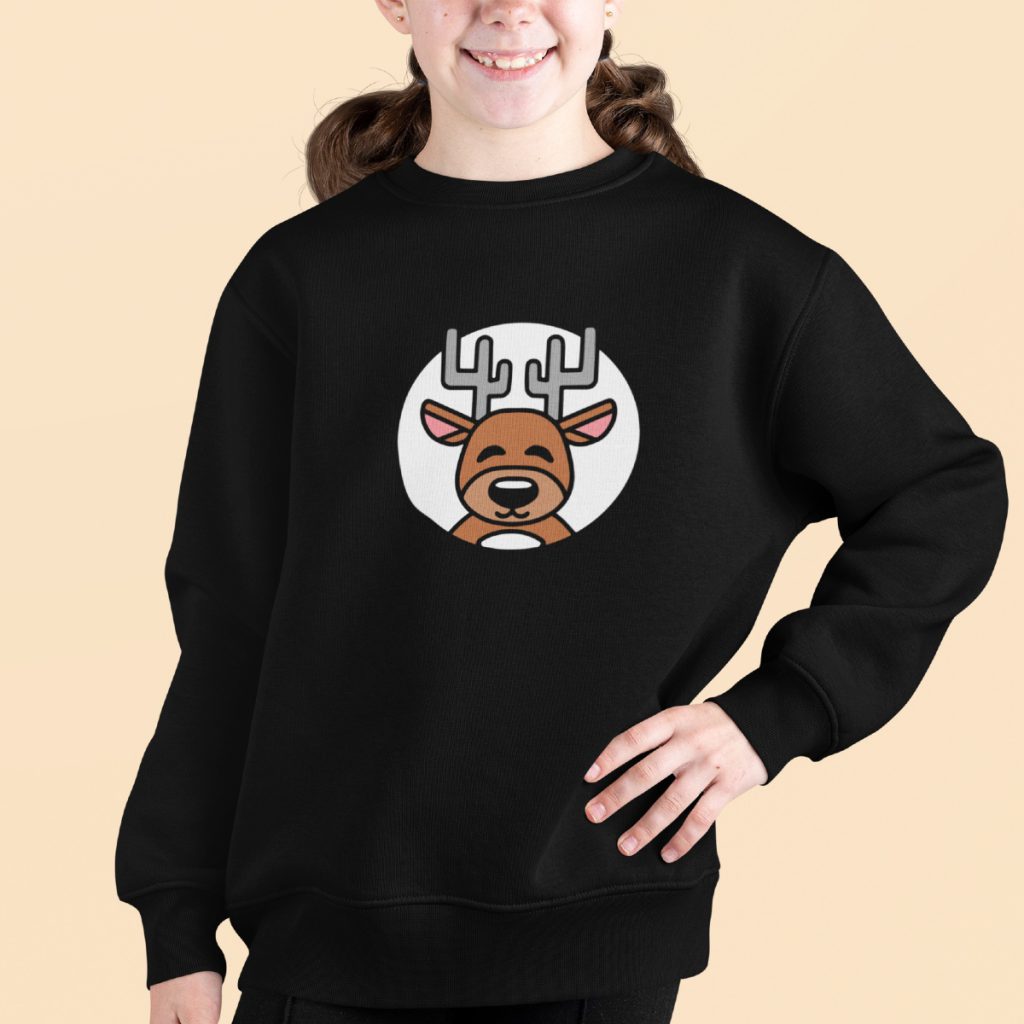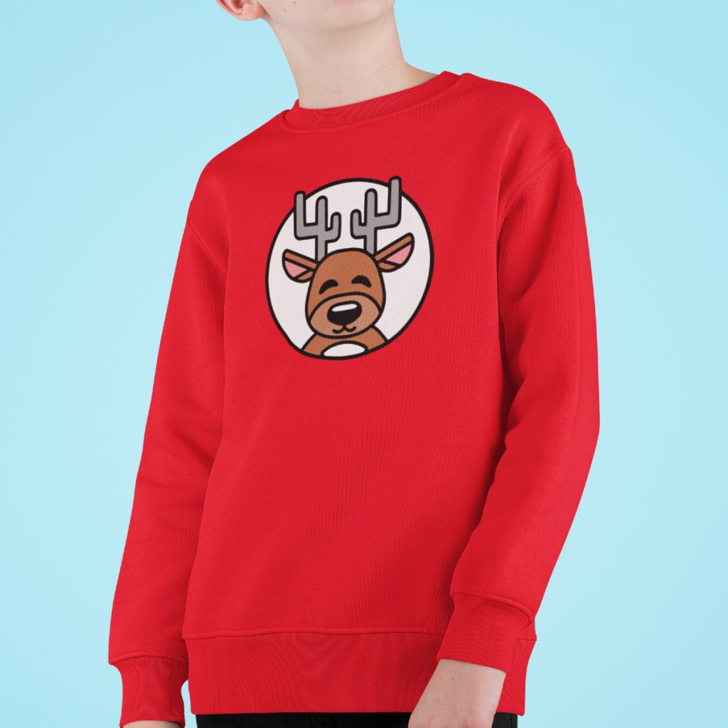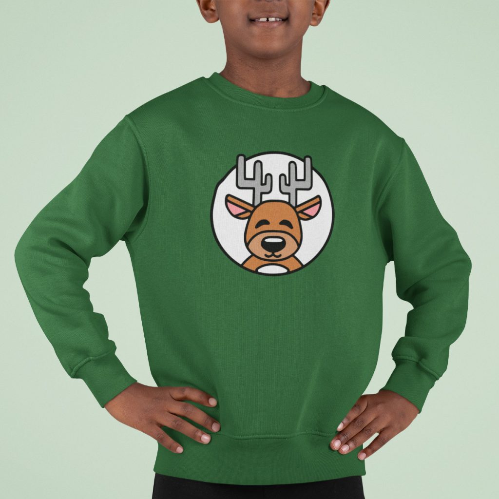 Een vrolijke kersttrui met het rendier Rudolf, speciaal voor kinderen ontworpen. Wie wordt hier nu niet vrolijk van? Deze fijne sweater is voor jongens en meiden van 3 t/m 14 jaar. Deze wil je aan naar school tijdens kerst of naar het kerstdiner met de familie. Verkrijgbaar in drie echte kerstkleuren: groen, zwart en rood. Maak gebruik van de maattabel onderaan de pagina voor de juiste maat.