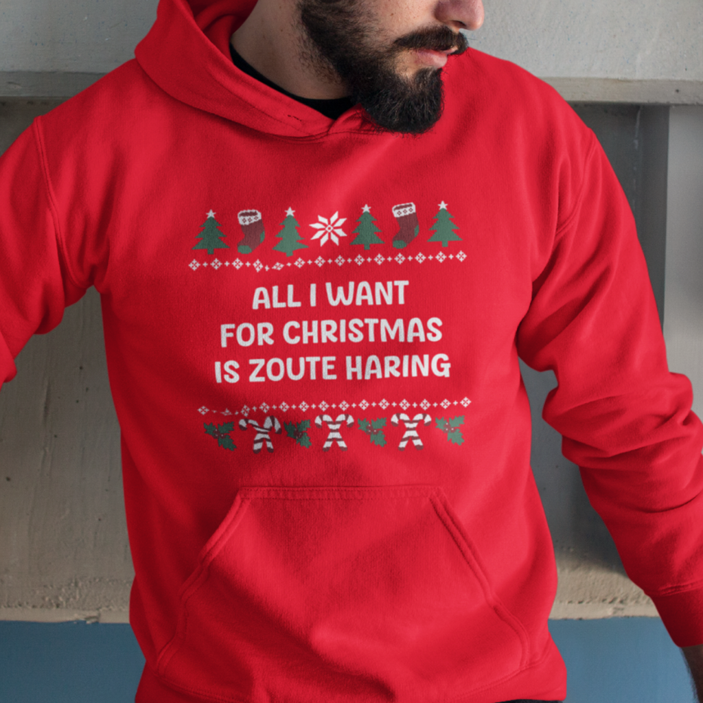 Volendamse Kerst Hoodie Rood All I Want For Christmas Is Zoute Haring
