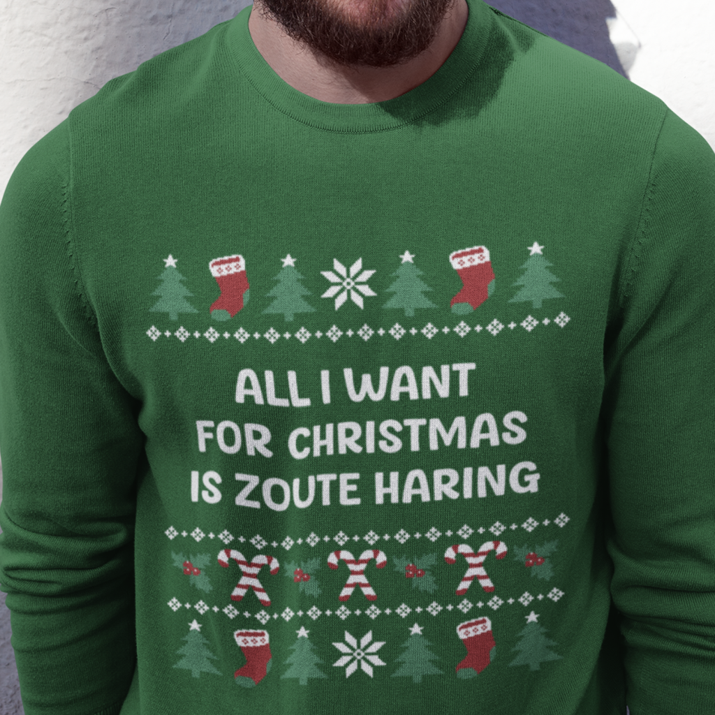 Volendamse Kerst Sweater Groen All I Want For Christmas Is Zoute Haring