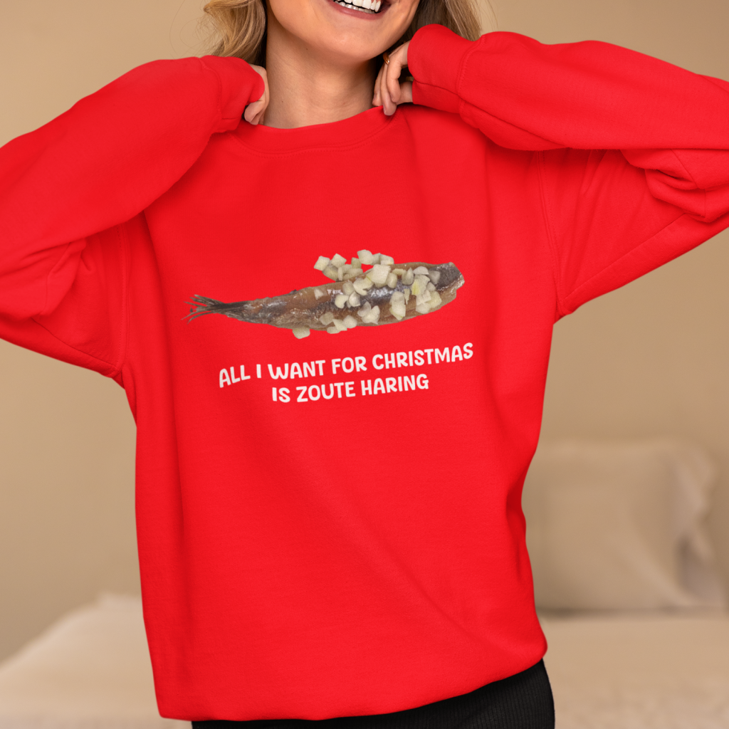 Volendamse Kerst Sweater Rood All I Want Is Zoute Haring Met Afbeelding