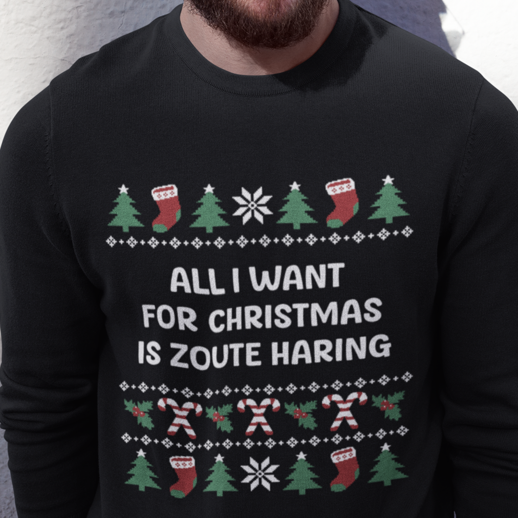 Volendamse Kerst Sweater Zwart All I Want For Christmas Is Zoute Haring